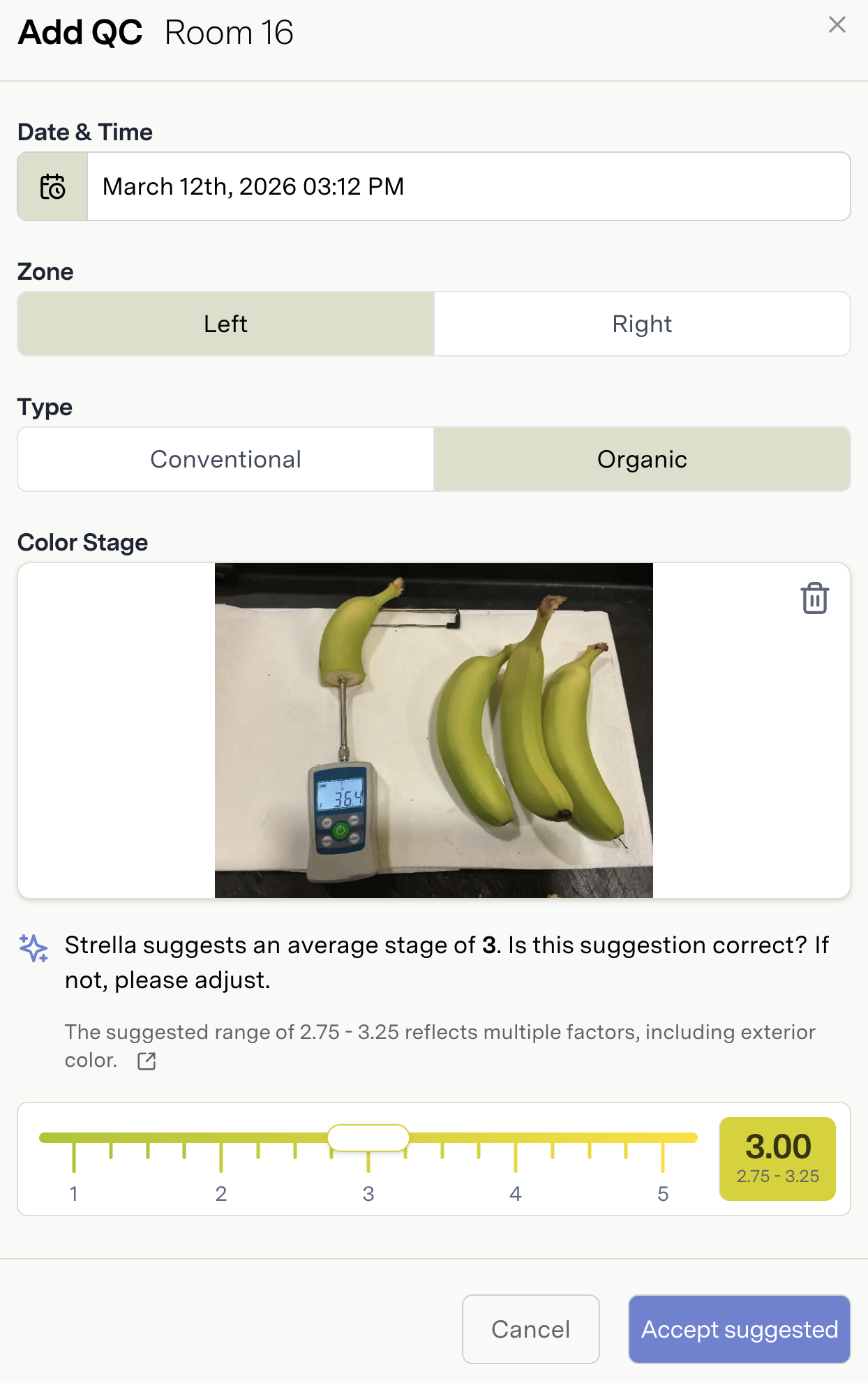During the Daily QC process, you are prompted to upload a photo. Please use one of the supported banana presentations. The model will generate a suggested stage after the photo is uploaded.