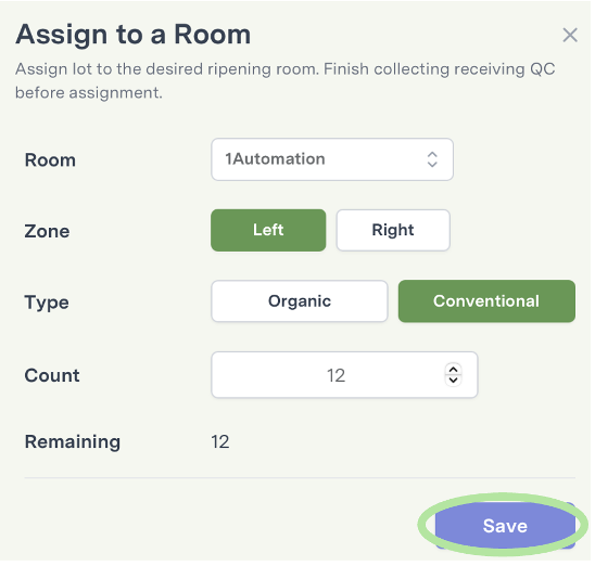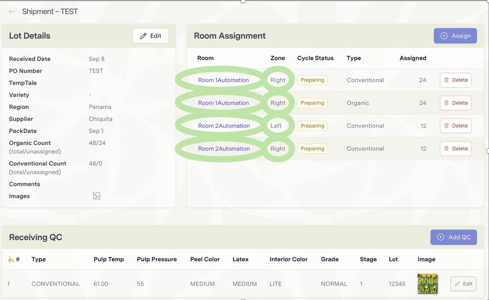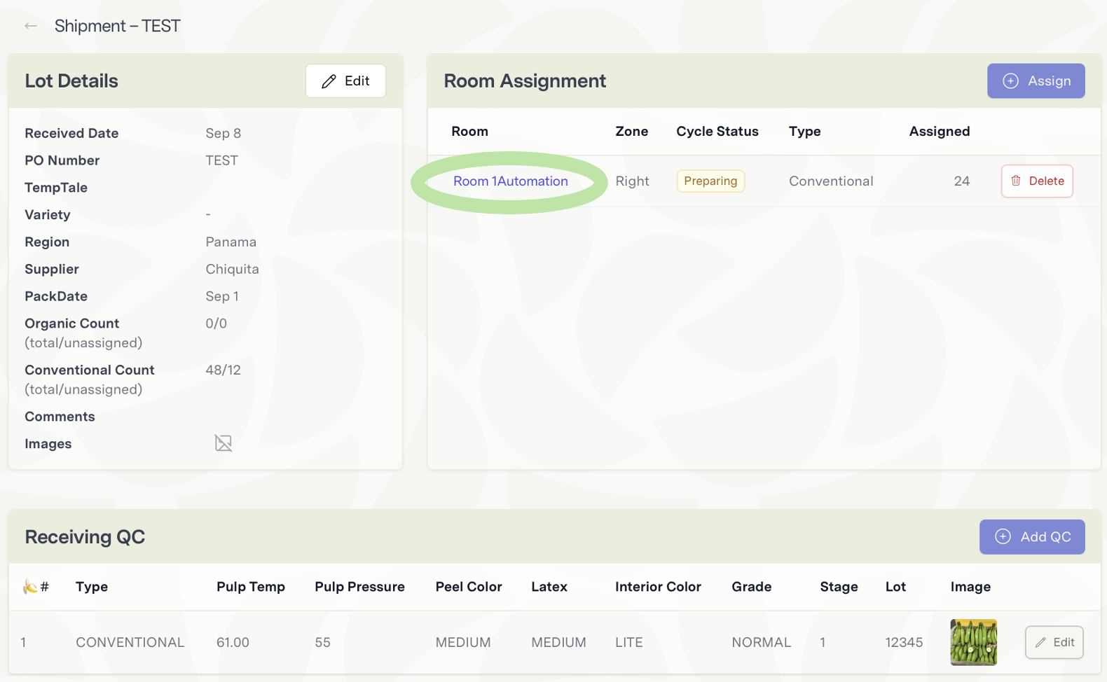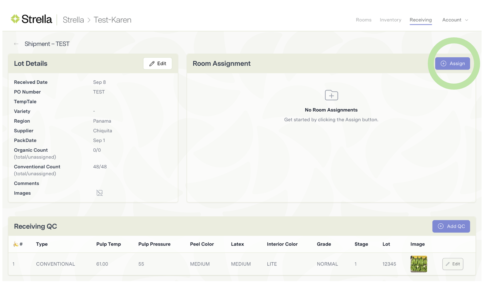 After receiving a shipment and entering a receiving QC, you are ready to assign that shipment to a room.